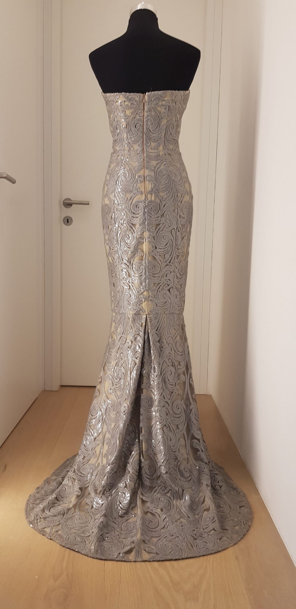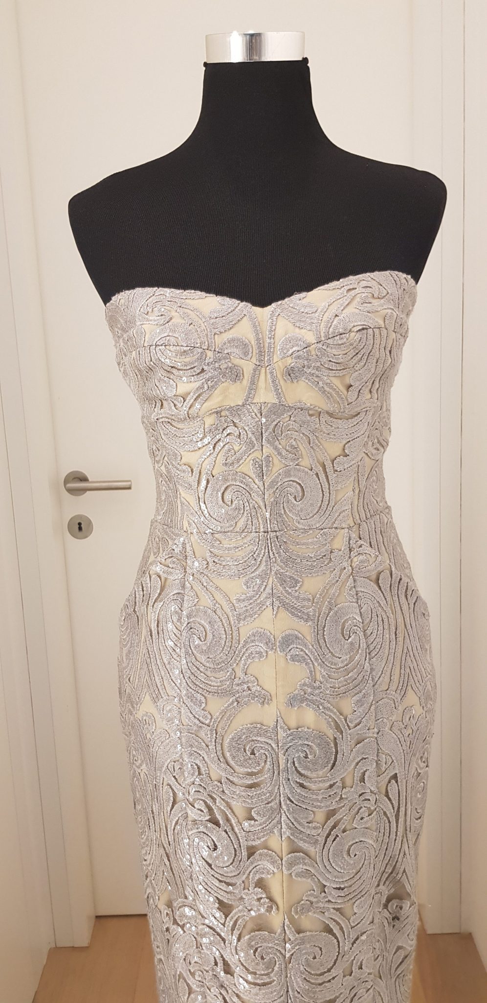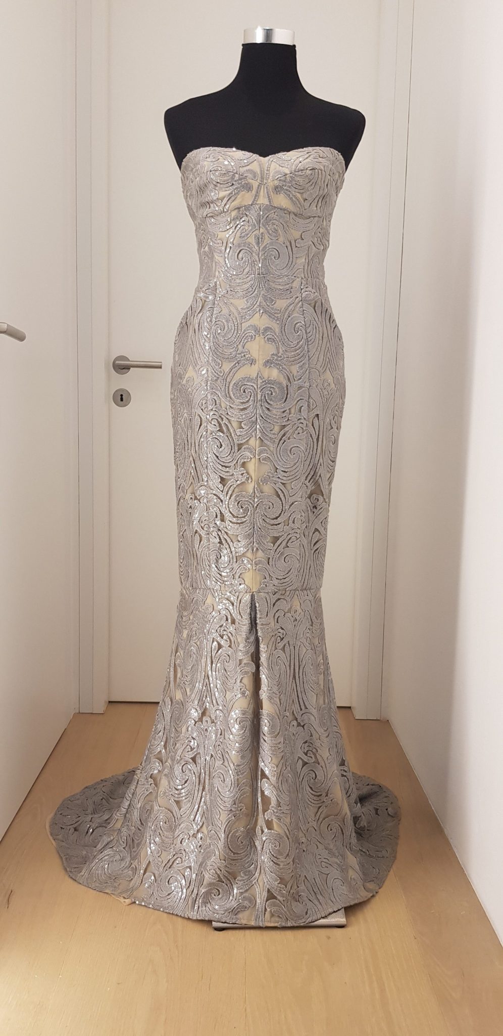 - Beschreibung: Edles bodenlanges schulterfreies Ballkleid aus Brokat, Stoff schillert silber, grau