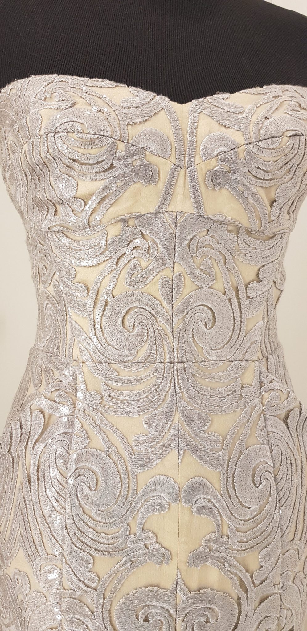 - Besonderheiten: Wunderschöner Brokatstoff, kompakt, formt die Figur