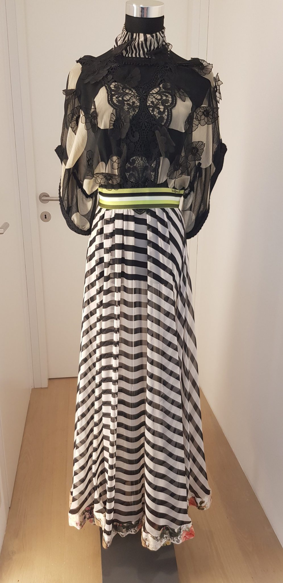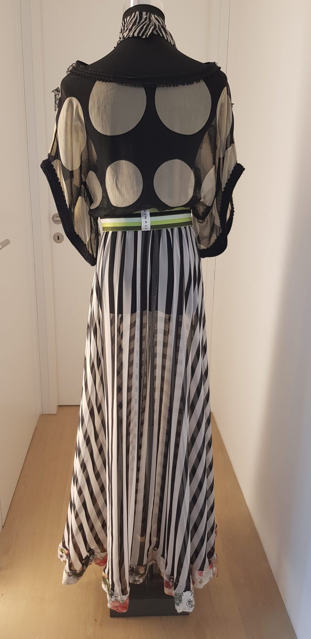 - Beschreibung: Showpiece der Ninali Kollektion 2018, Robe aus gestreifter Seide, mit Blumen bestickt, bodenlang