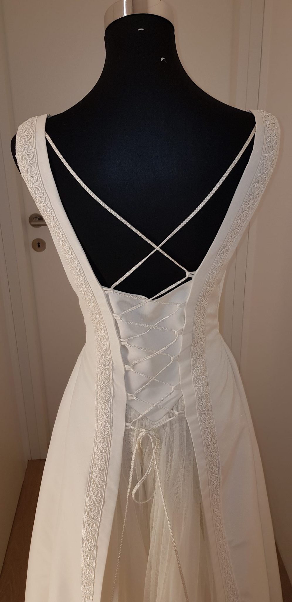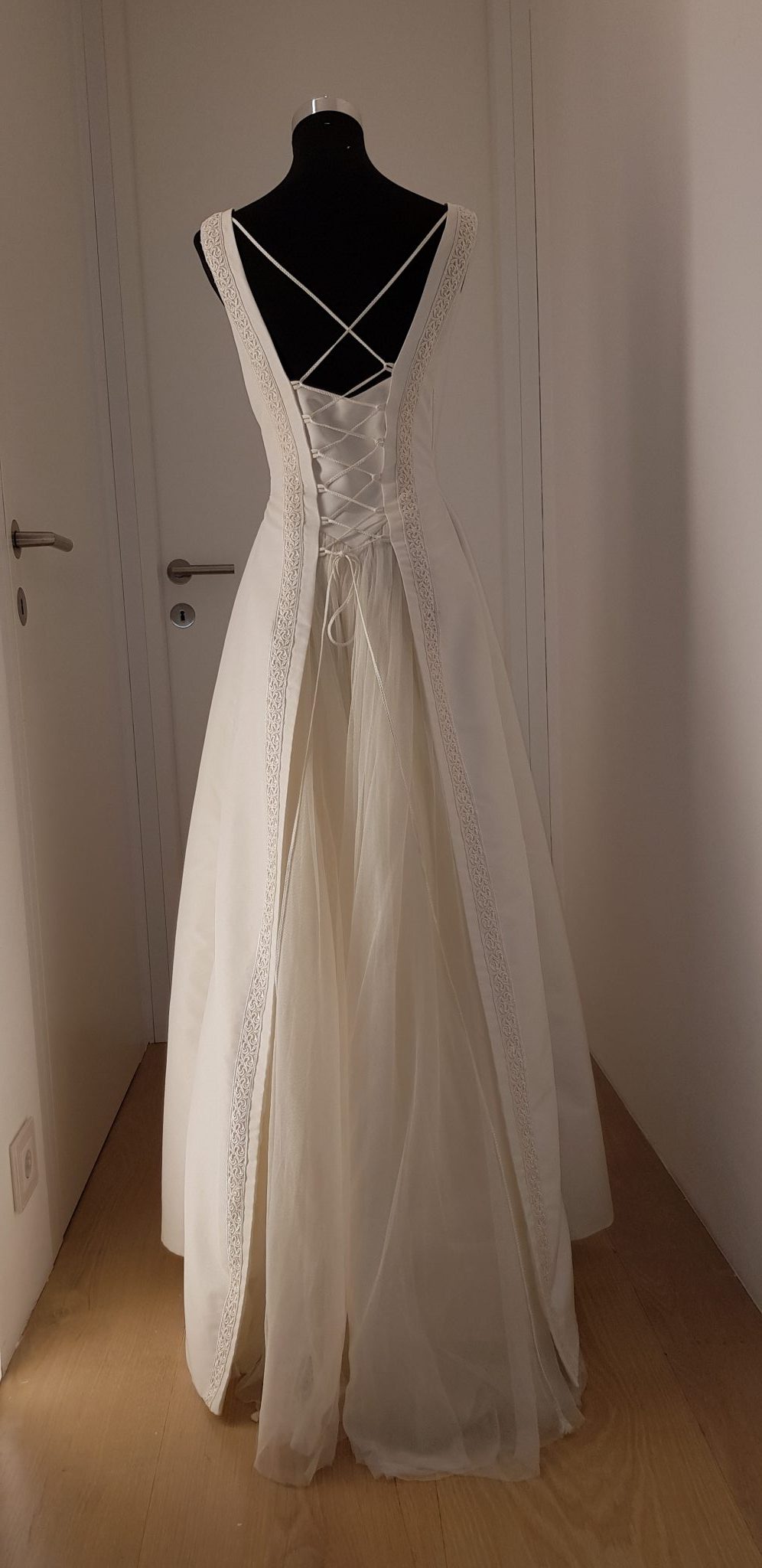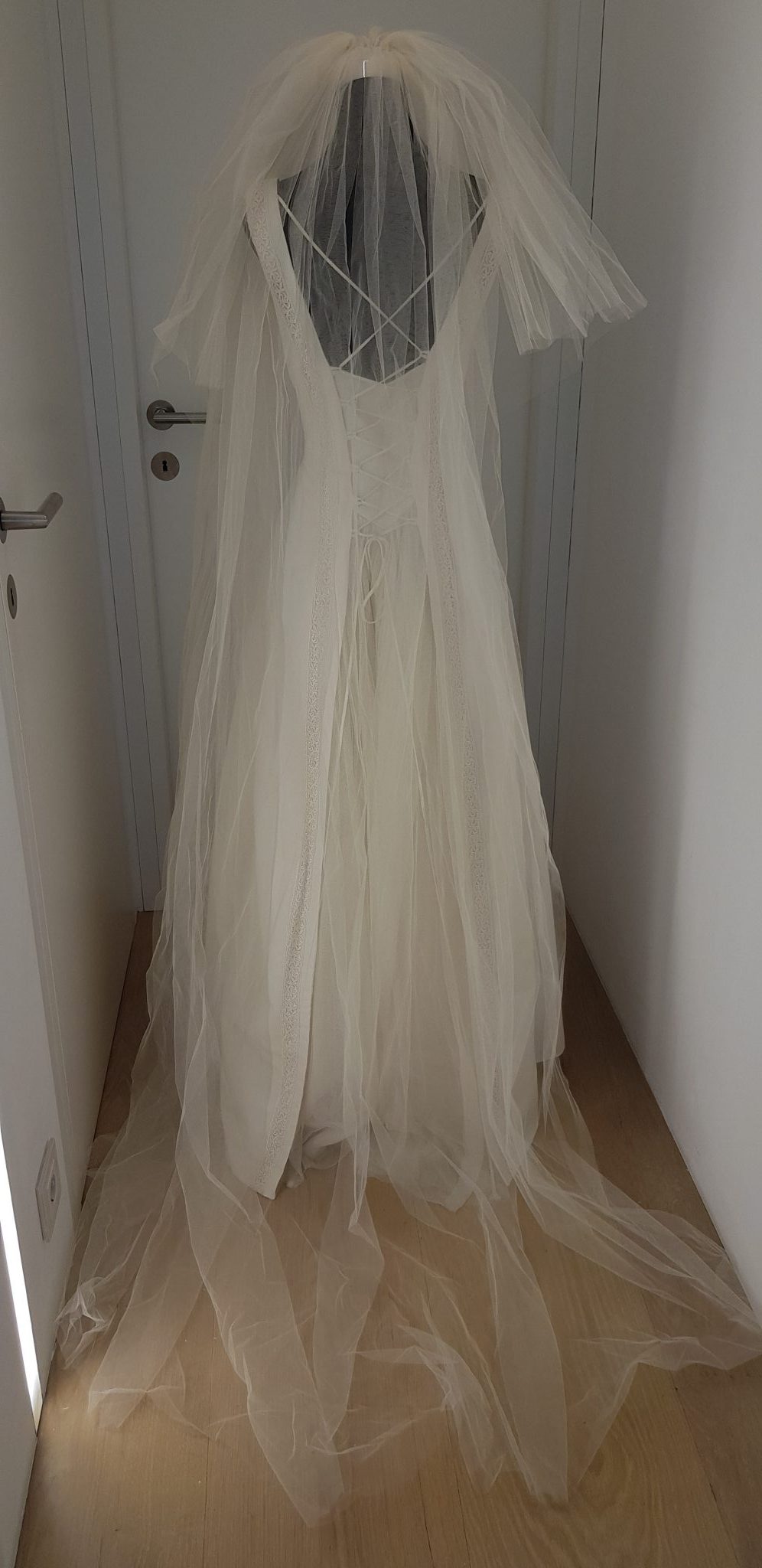 - Beschreibung: Edles Eierschalen-weißes Brautkleid mit Bordüre und extra langem Schleier