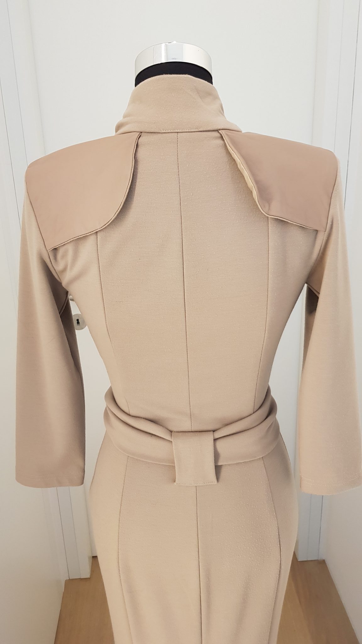 • Beschreibung: Langes, figurbetontes Baumwollstretchkleid mit Lederbeschlägen auf Schultern,  Gürtel mit großen Ledertaschen
