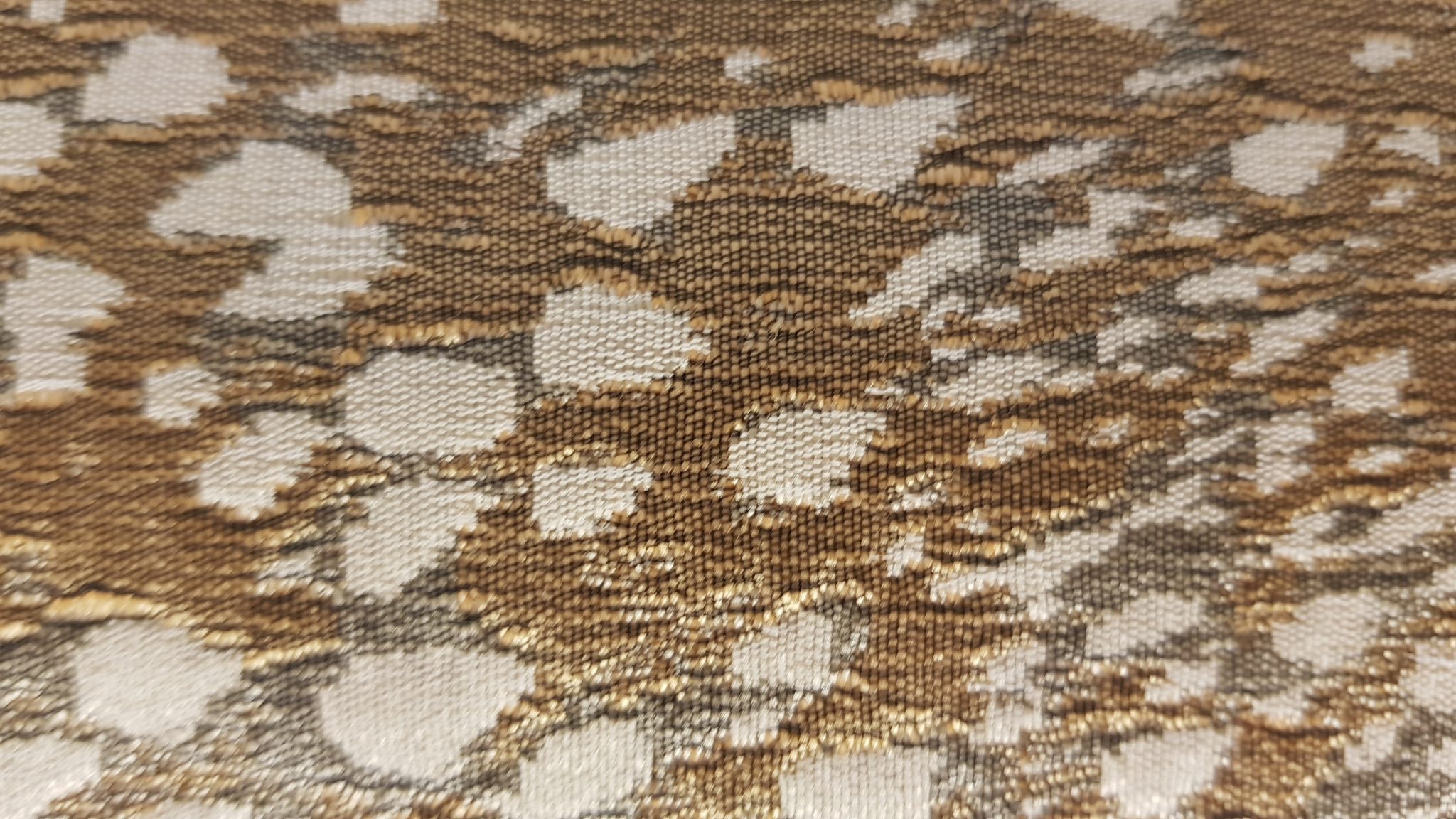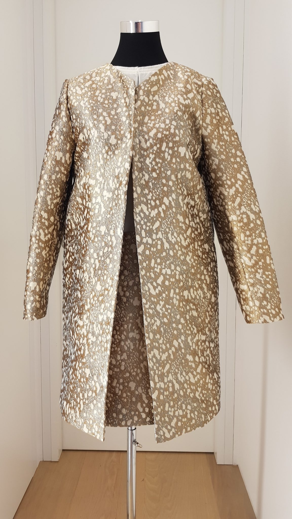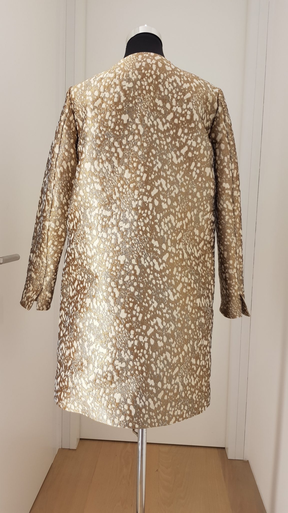- Beschreibung: Edles gold/weiß gemustertes Kostüm mit Gehrock und kurzem geraden Rock mit weißer Seidenbluse