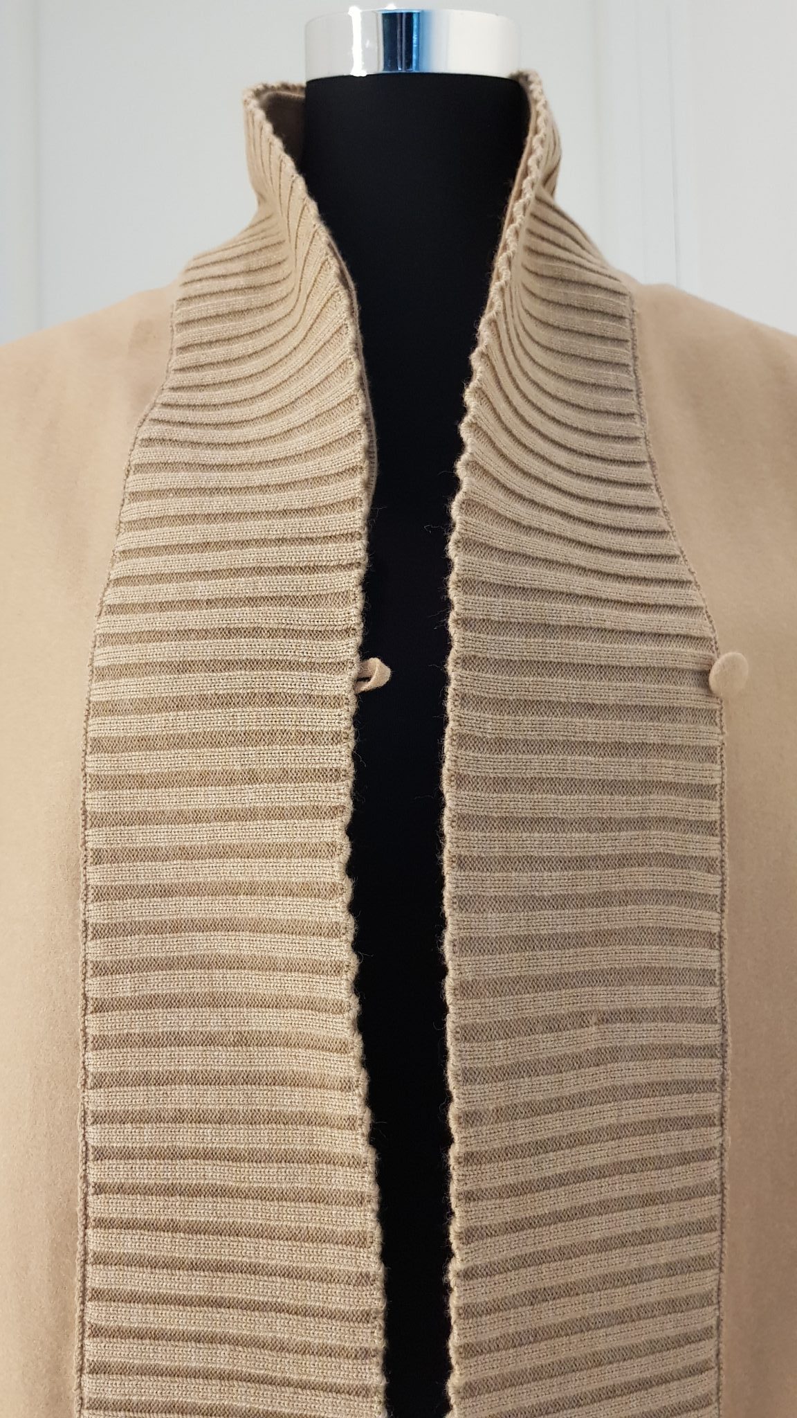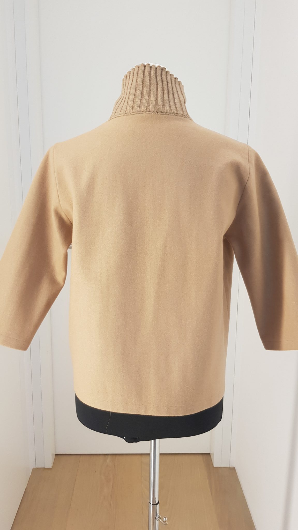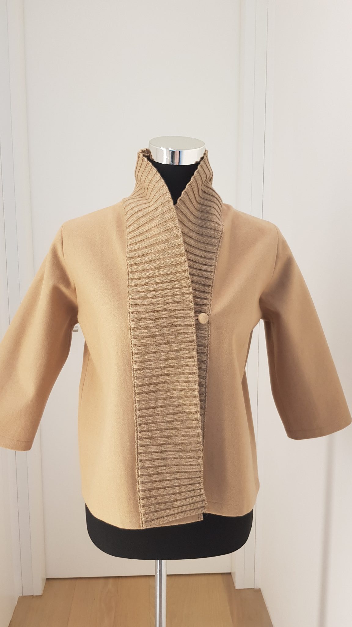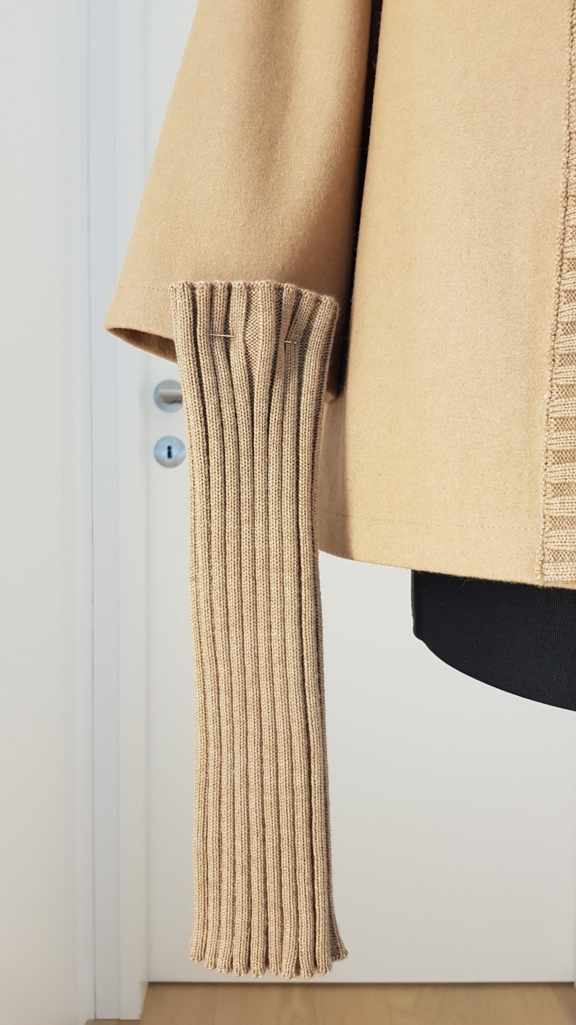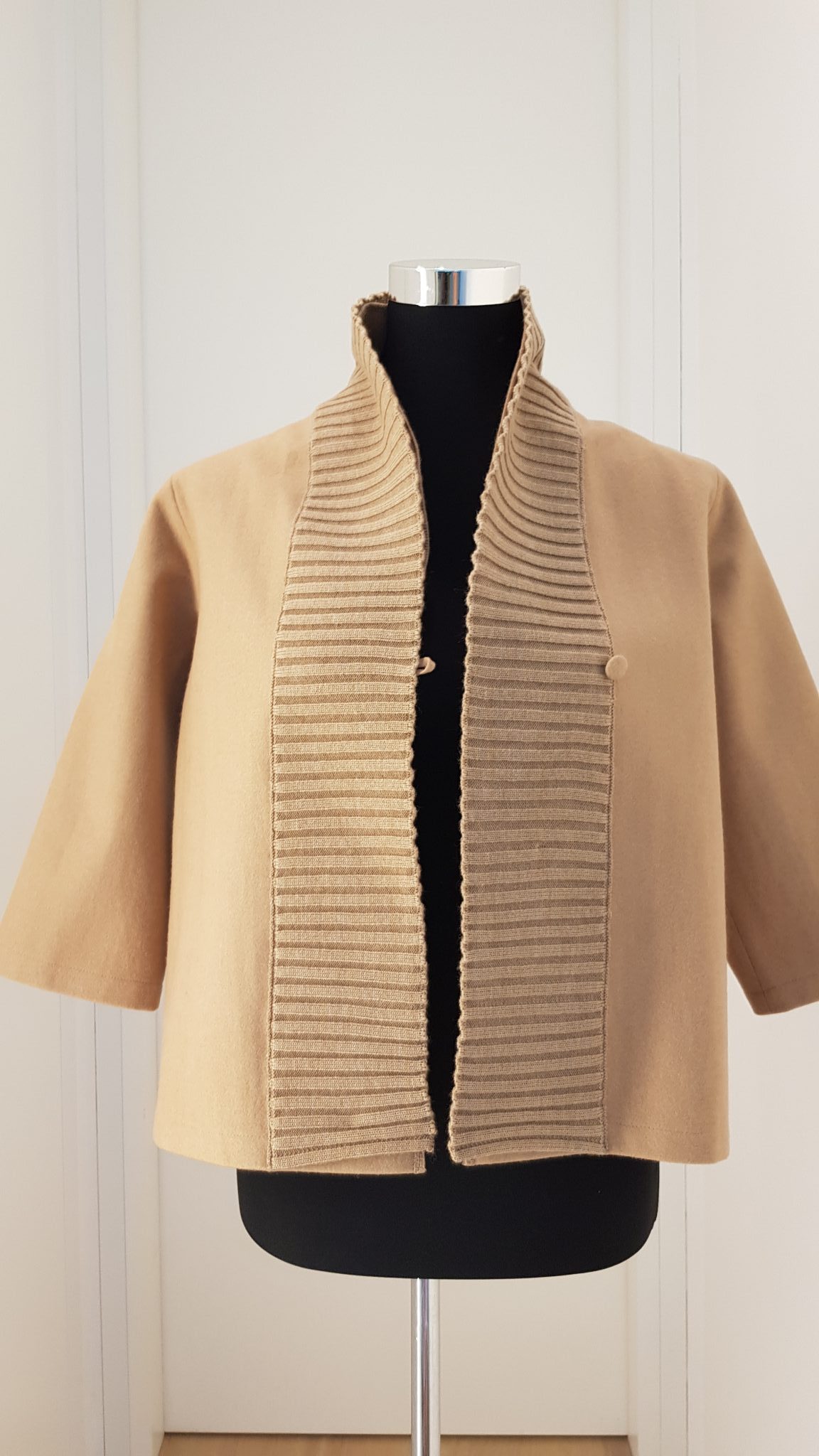 - Beschreibung: Extravagantes, gerade geschnittenes Sakko aus Wolle mit geripptem Revers und Armstulpen im gleichen Rippstrick
