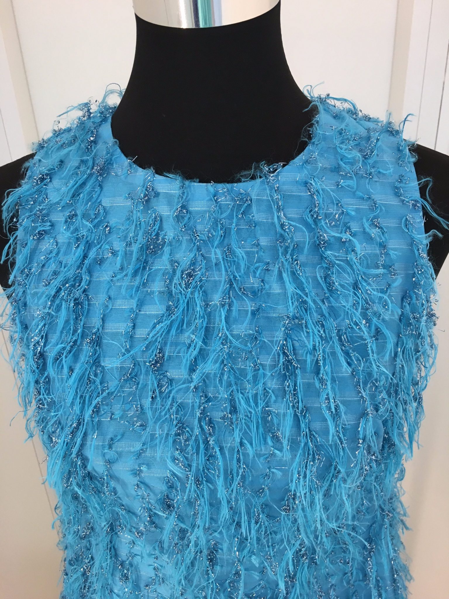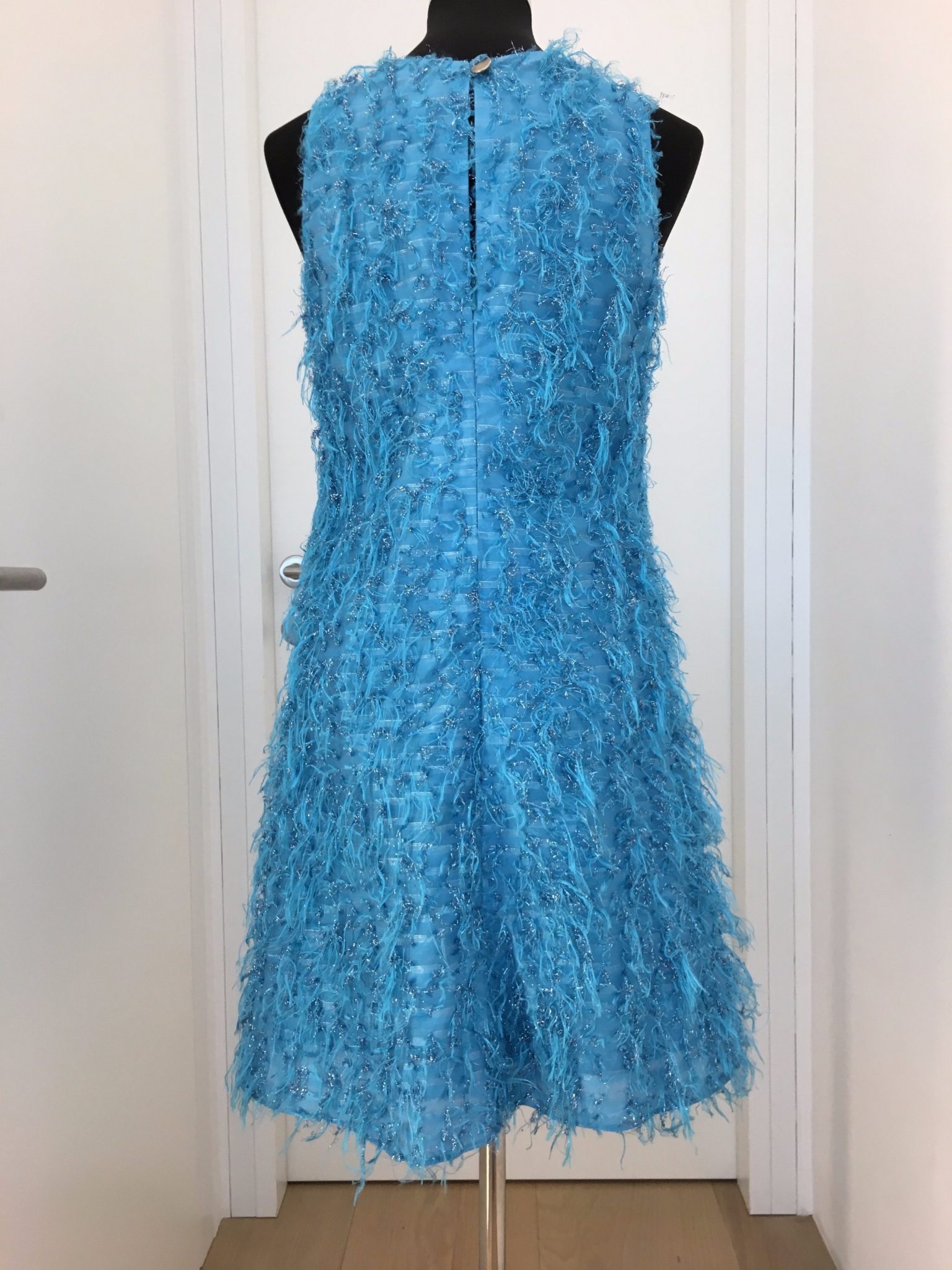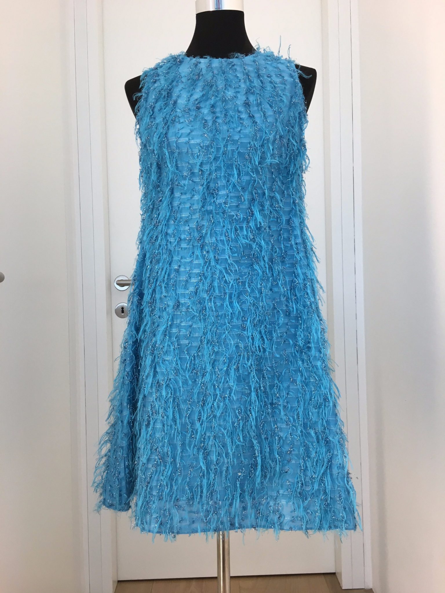 - Beschreibung: Kurzes A-Linien Cocktailkleid in blitzblau mit Zotteln mit Glitzerfäden, silberner Knopf im Rücken