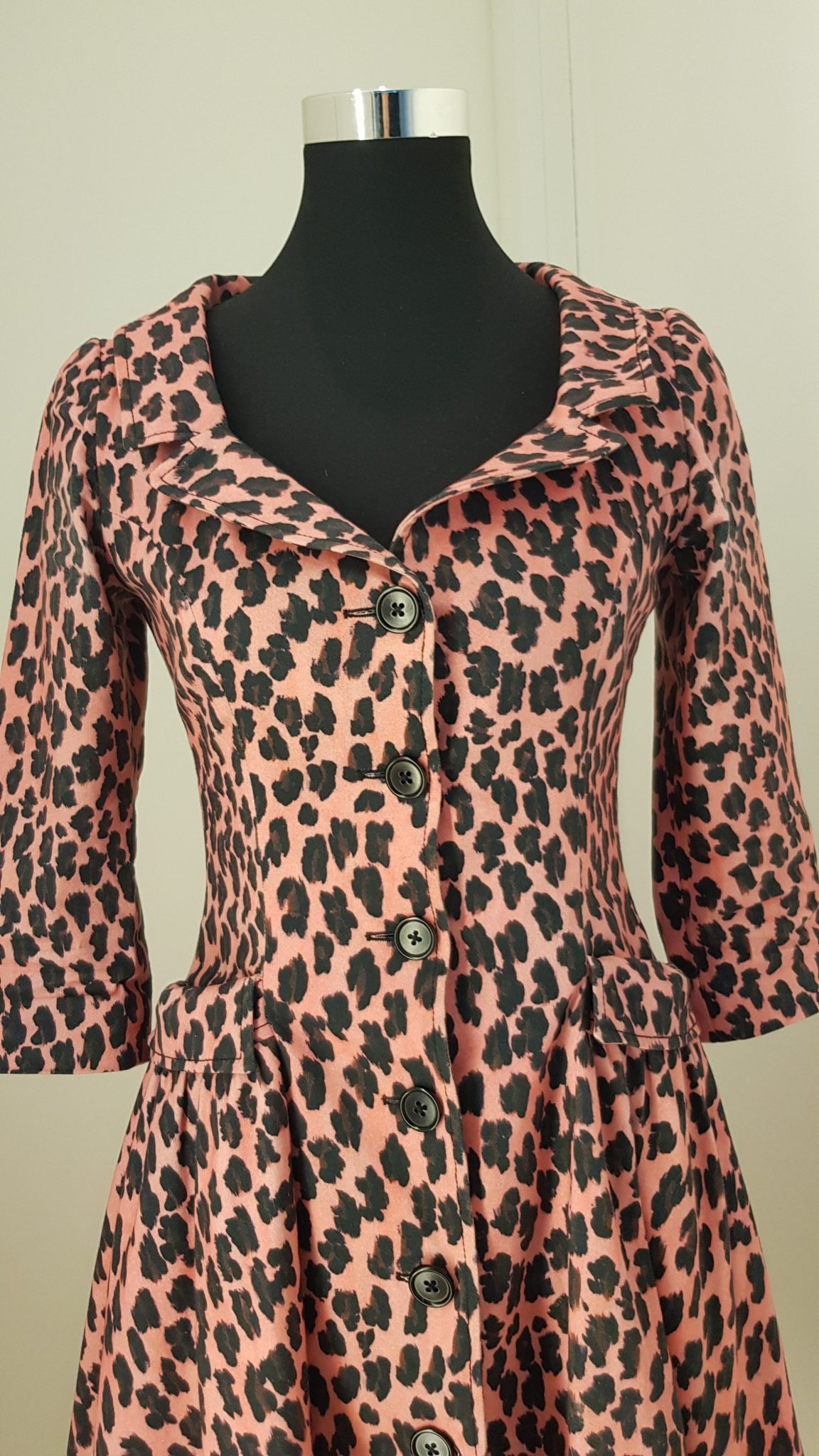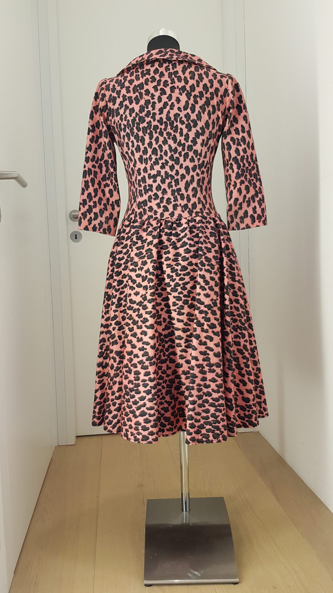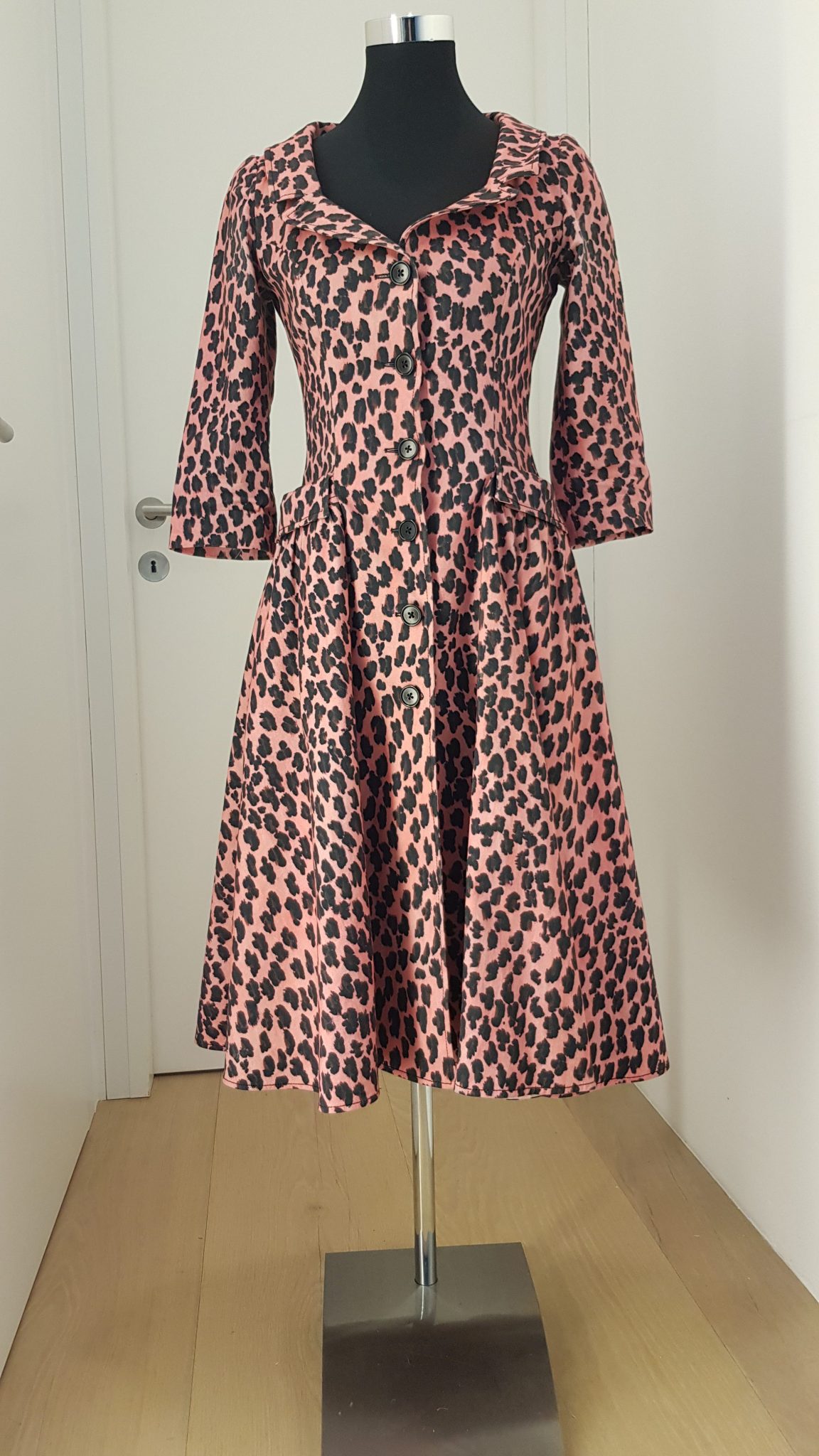 - Beschreibung: Feminines Cocktail-/Business Kleid mit Schneewittchenkragen, ausgestelltem Rock, 3/4-Ärmel, rosa/schwarz Leoparden Print, durchgeknöpfte Knopfleiste, aufgesetzte Taschen, knielang