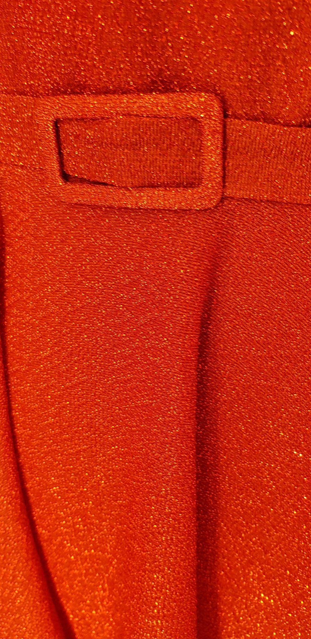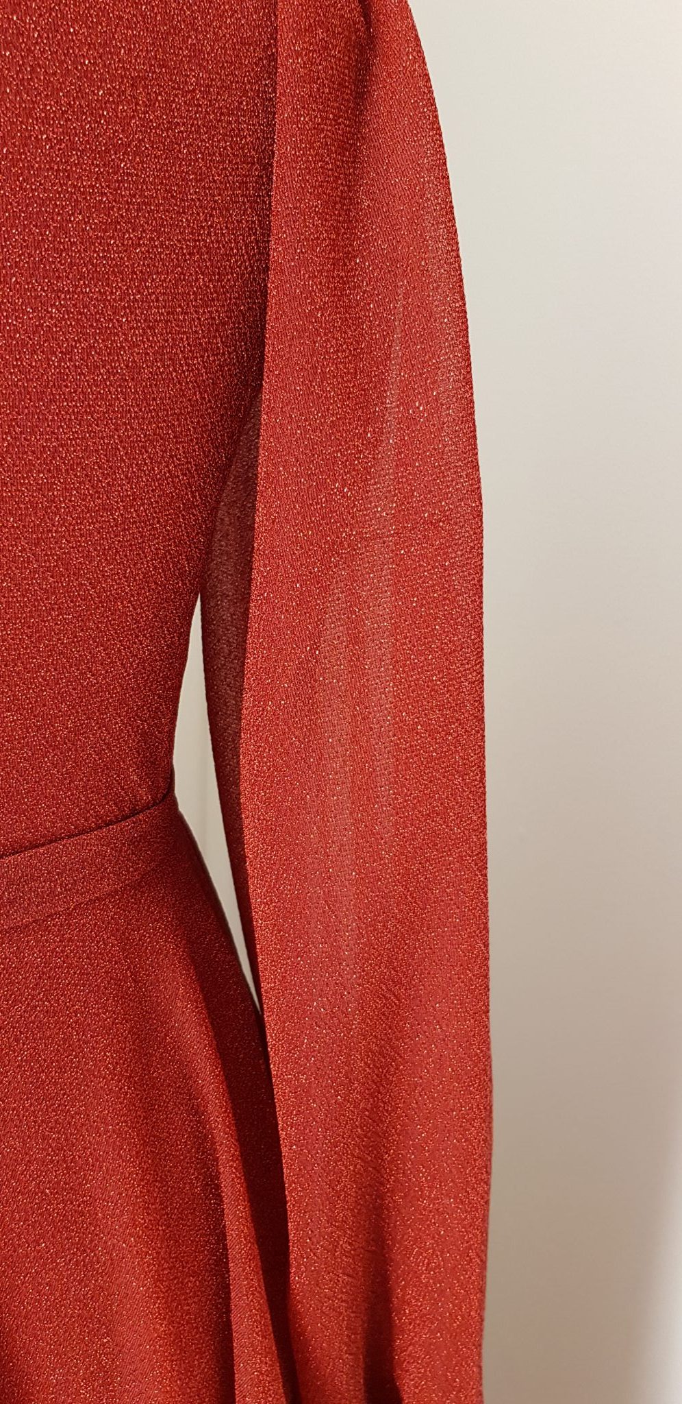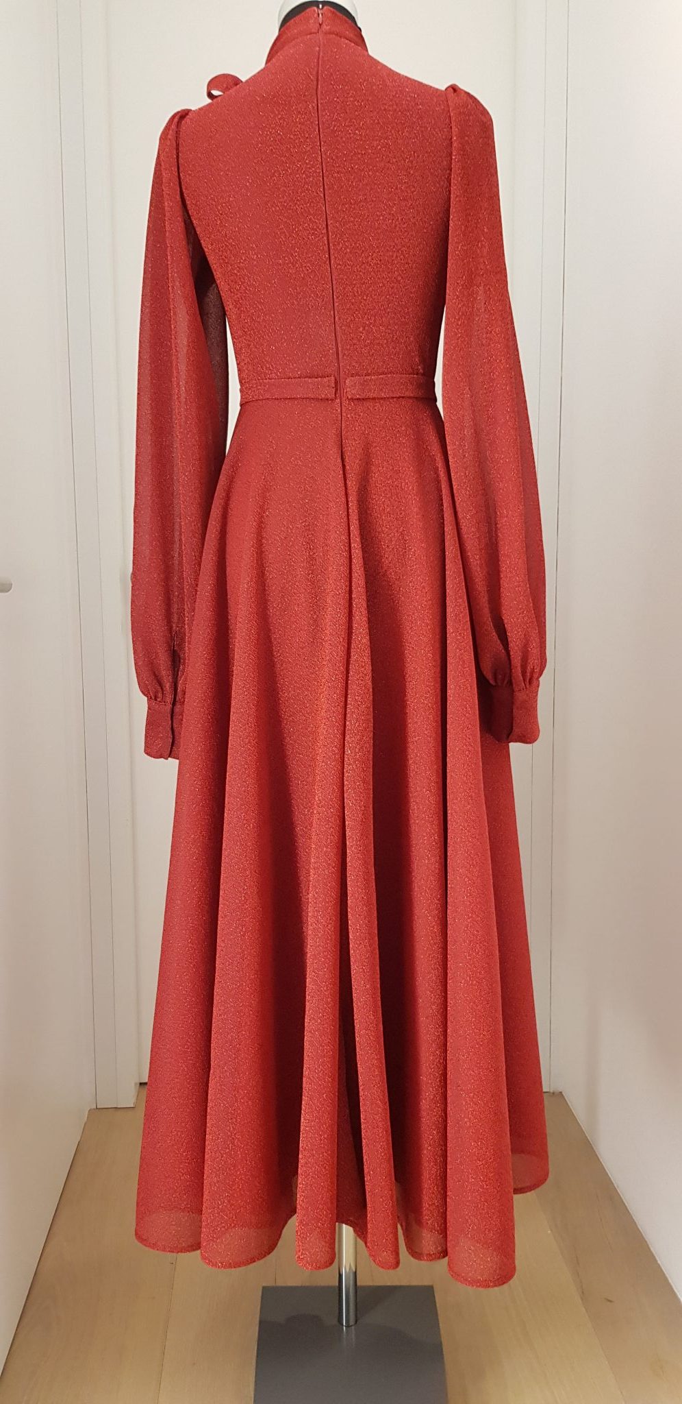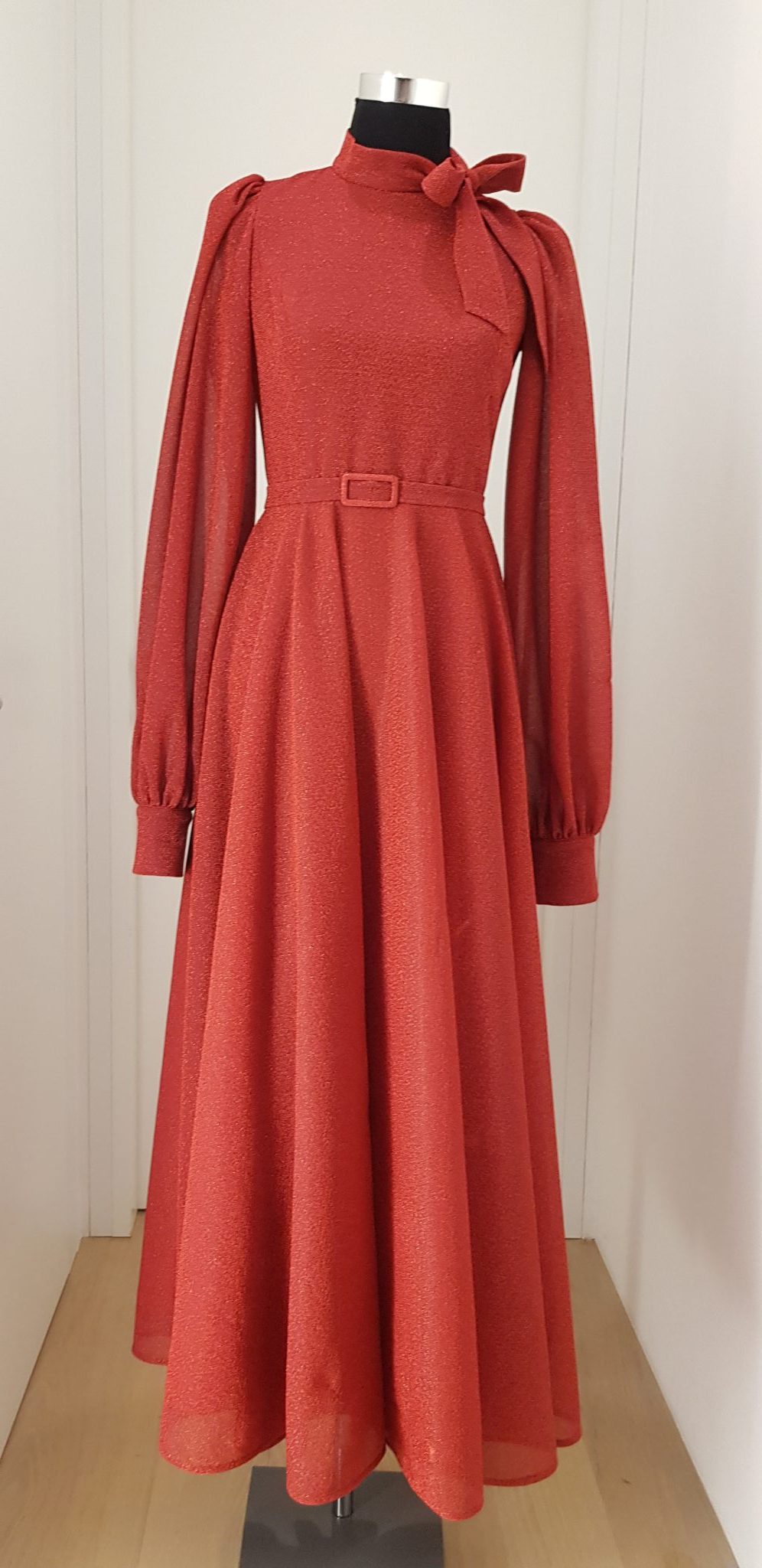 - Beschreibung: Knöchellanges zartes Abendkleid mit hohem Kragen und gebundener Schleife, Ärmel transparent, Stoff leicht glitzernd