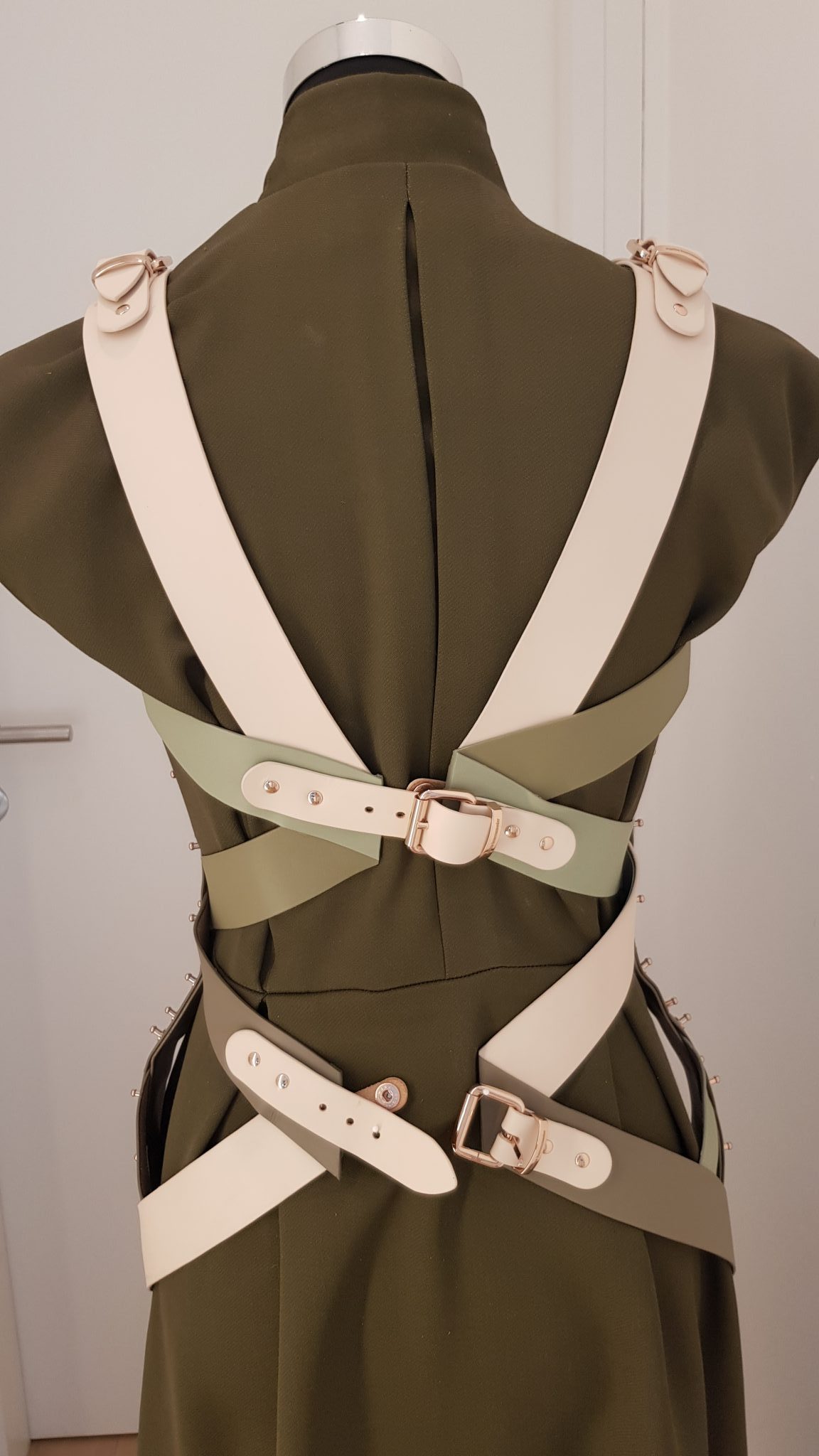 - Beschreibung: Waldgrünes Wickelkleid mit Kragen und angeschnittenen Ärmeln, knielang, schwingender Rock. Darüber gekreutzte Lederbänder, die Lederkorsage über die Hüften formen